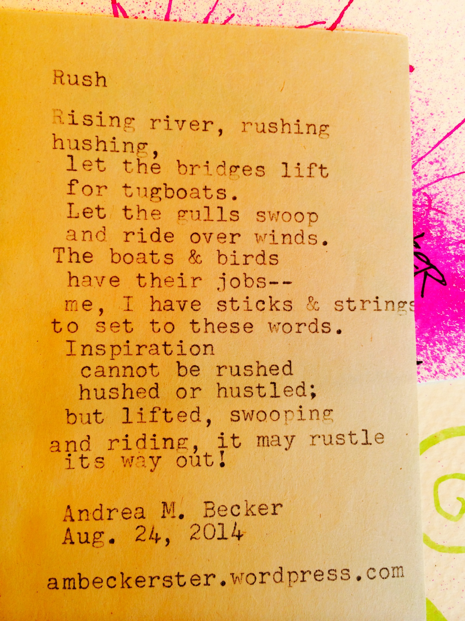 Rush (Insta-poem by Andrea) Share this: Click to share on Facebook (Opens in new window) Facebook Click to share on X (Opens in new window) X Click to email a link to a friend (Opens in new window) Email Click to share on Pinterest (Opens in new window) Pinterest Click to share on LinkedIn (Opens in new window) LinkedIn Like Loading... Related