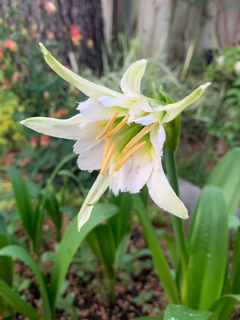 Ahhhhh! The fragrant blooms of the Peruvian Daffodils are happy it’s their turn to put on a show. Welcome shimmers and winged friends. Come one, come all and enjoy.